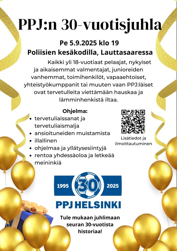 Vuoden päätapahtumaa PPJ:n 30-vuotisjuhlaa vietetään perjantaina 5.9. klo 19 Lauttasaaressa, Poliisien kesäkodilla. Tämän ainutlaatuisen tilaisuuden liput ovat myynnissä myClubin verkkokaupassa, muista ostaa omasi ajoissa sillä lippuja on rajoitettu määrä! huom. juhlien ikäraja on 18 v. Tapahtuman tuotto ohjataan PPJ Tukirahastolle, joka jakaa avustuksia taloudellisen tuen tarpeessa oleville pelaajien perheille.